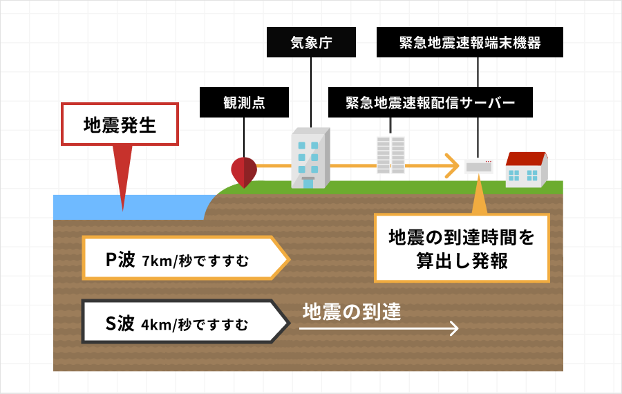 これは、震源に近い地震計が初期微動(P波)を検知した直後に、強い揺れ(S波)が届く前に警報を発信する仕組みです。
