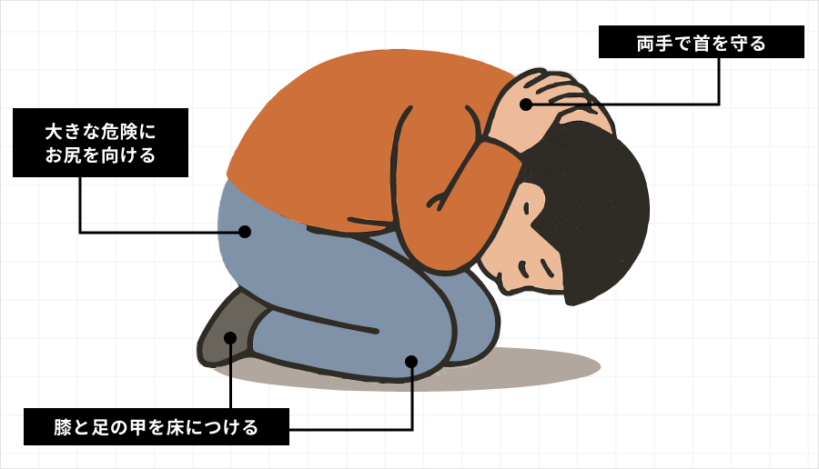 警報音が鳴ったら、すぐに姿勢を低くし、落下物や転倒物から離れ、身を守る体勢を取ることが重要です。