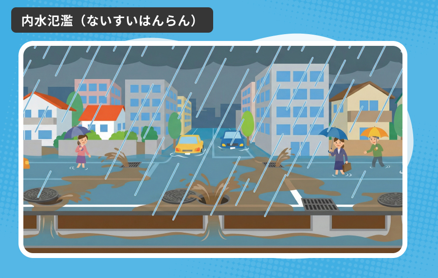 下水道(げすいどう)が「もうこれ以上、水を飲みこめないよ!」といっぱいになってしまうんだ。すると、行き場を失った雨水が、マンホールや雨水ますから地上に逆流(ぎゃくりゅう)して、道路にあふれ出してしまう。これが「内水氾濫(ないすいはんらん)」だよ。