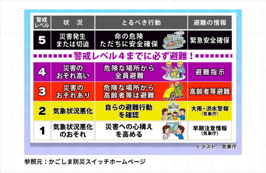 一般の人が逃げ出す「避難指示(レベル4)」では、道路がすでに渋滞していたり、足元が悪くなっていたりします。高齢者を抱えての移動には、健康な人の2倍以上の時間がかかることを想定し、「空が明るく、足元が乾いているうち」に避難を完了させてください。