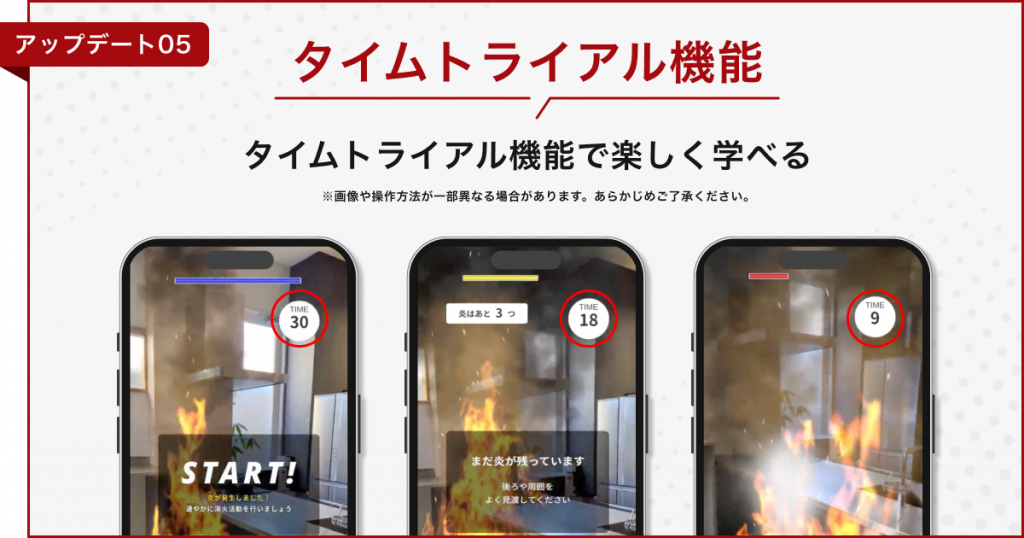 消火までのスピードを競うタイムトライアル機能を新たに追加しました。ゲーム感覚で楽しみながら防災行動を学べるため、学校行事や体験型イベントにも最適です。消火までのスピードを競うタイムトライアル機能を新たに追加しました。